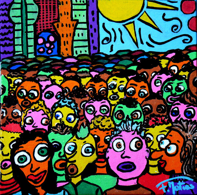 peinture sur carton entoilé, 15X15 cm, représentant une foule dans une ville. peinture à l'acrylique et posca.