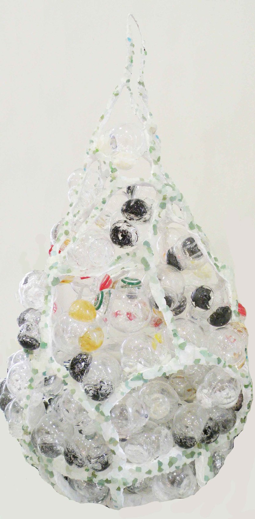 Cette sculpture fait partie de l'exposition L’Essence de Nice. Lauréate du 1er Trophée de l'Environnement à Nice en 2010. Réalisé à partir de déchets, représente une goutte d’eau de mer. Les boules plastiques incarnent les molécules d’eau.L’eau se compose de deux atomes d’Hydrogène et d’un atome d’Oxygène. Ainsi la formule de l’eau se nomme H2O. Déchets utilisés: coton-tige, aluminium, morceaux de verre, médicaments, polystyrène, papier journal, cigarette, capsules de bière, cartouches d'en