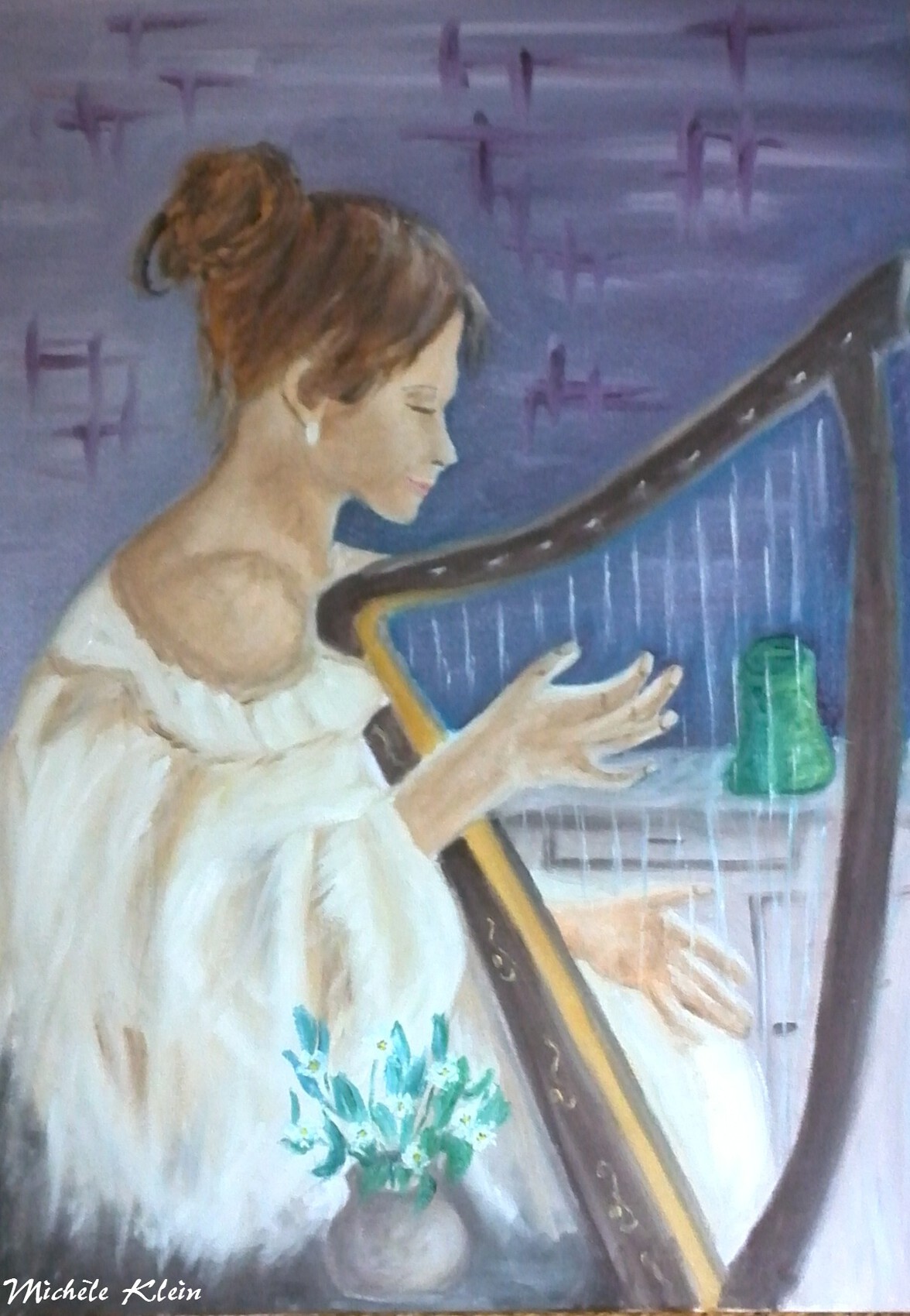 Huile sur toile de 50x70 représentant une jeune femme jouant de la harpe. ( Sans la musique, la vie serait une erreur.)