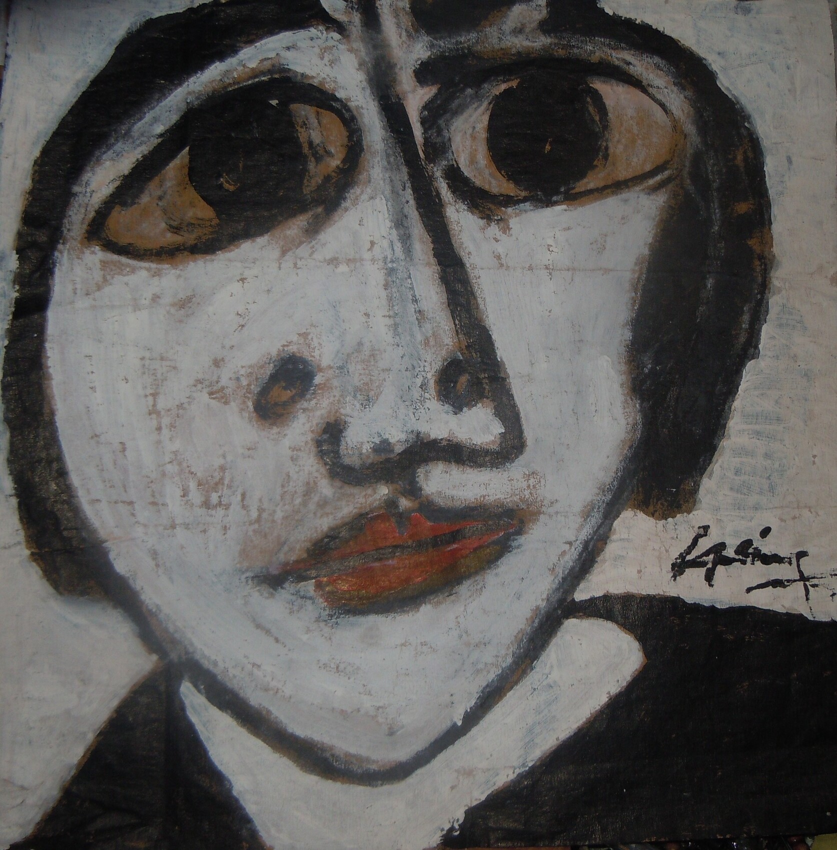 Dans La Passagère, Haimer capture l'instant suspendu d'une existence en mouvement. Ce visage énigmatique, aux traits volontairement simplifiés mais profondément expressifs, semble contenir toute l'intensité d'une histoire non dite. Les grands yeux sombres, qui dominent la composition, évoquent une quête silencieuse, une attente empreinte de mystère et de vulnérabilité. Les tons terreux et le noir profond se marient à des touches de blanc et de rouge pour traduire un équilibre délicat entre la