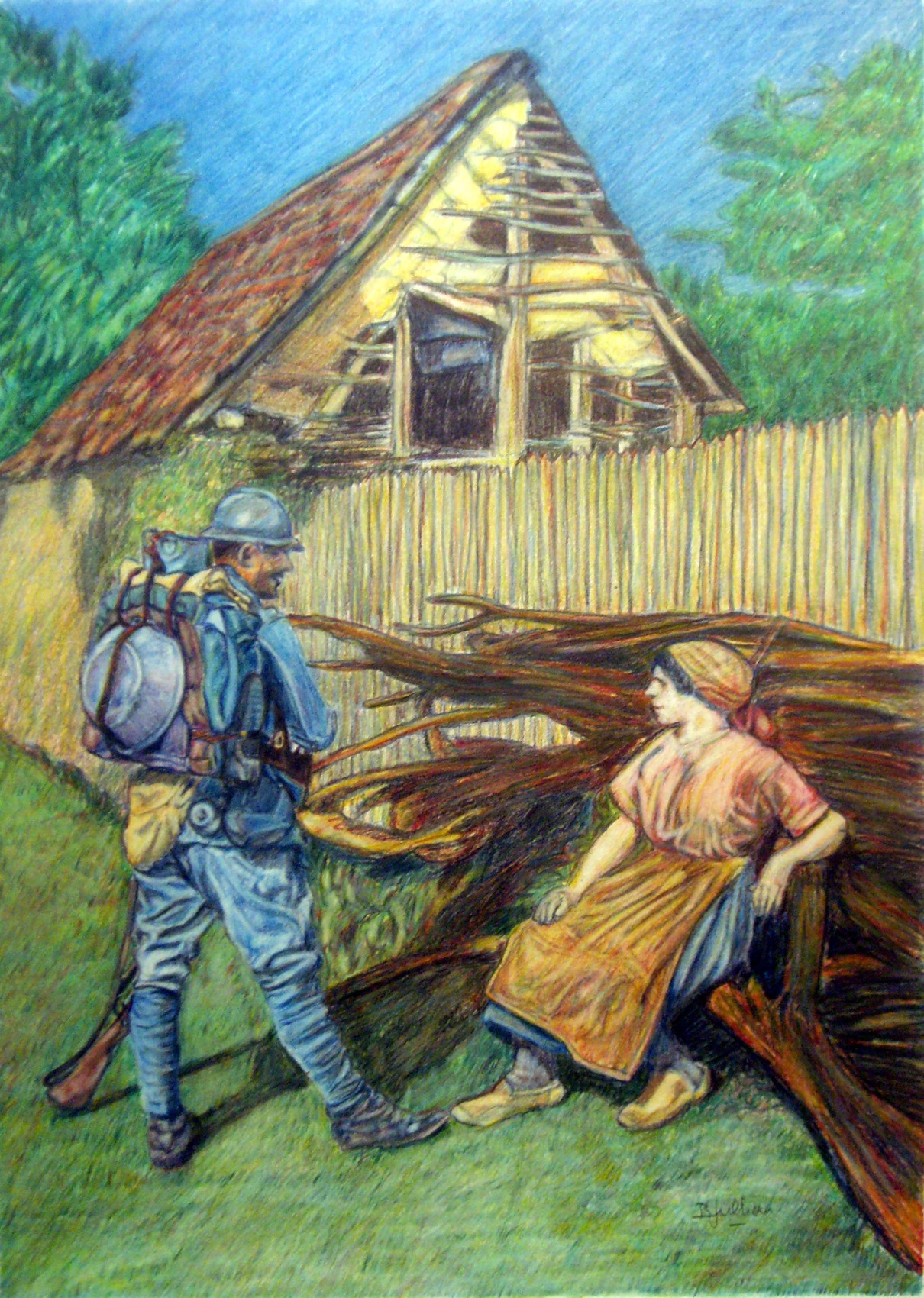 DESSIN COULEURS sur Papier CANSON Format Raisin (50 X 65 cm) , realise au crayon sec par l'Artiste Bernard JULLIAN DESSIN ORIGINAL - avec signature de l'Artiste 1914 1918 - LA PAYSANNE ET LE SOLDAT Realise d'apres un Document