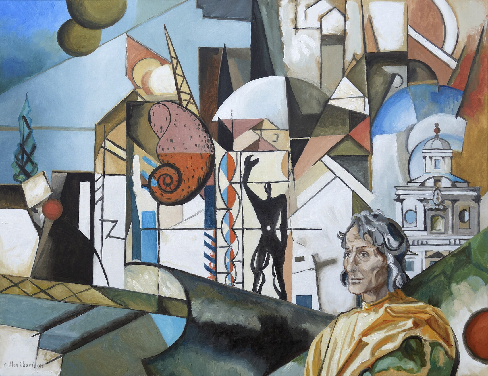 HST 50 x 65 cm, 2020. Une allégorie de l’architecture et de ses savoirs : connaissance de la nature et de ses formes, de la géométrie et de ses proportions, de l’homme et de ses habitats, et des sciences de la construction. Toile synchronistique, avec un architecte dessiné par Dürer côtoyant le « modulor » du Corbusier, et un foisonnement de figures inspirées d’un paysage d’Albert Gleizes ; sur la droite, la silhouette d’un église baroque maltaise.