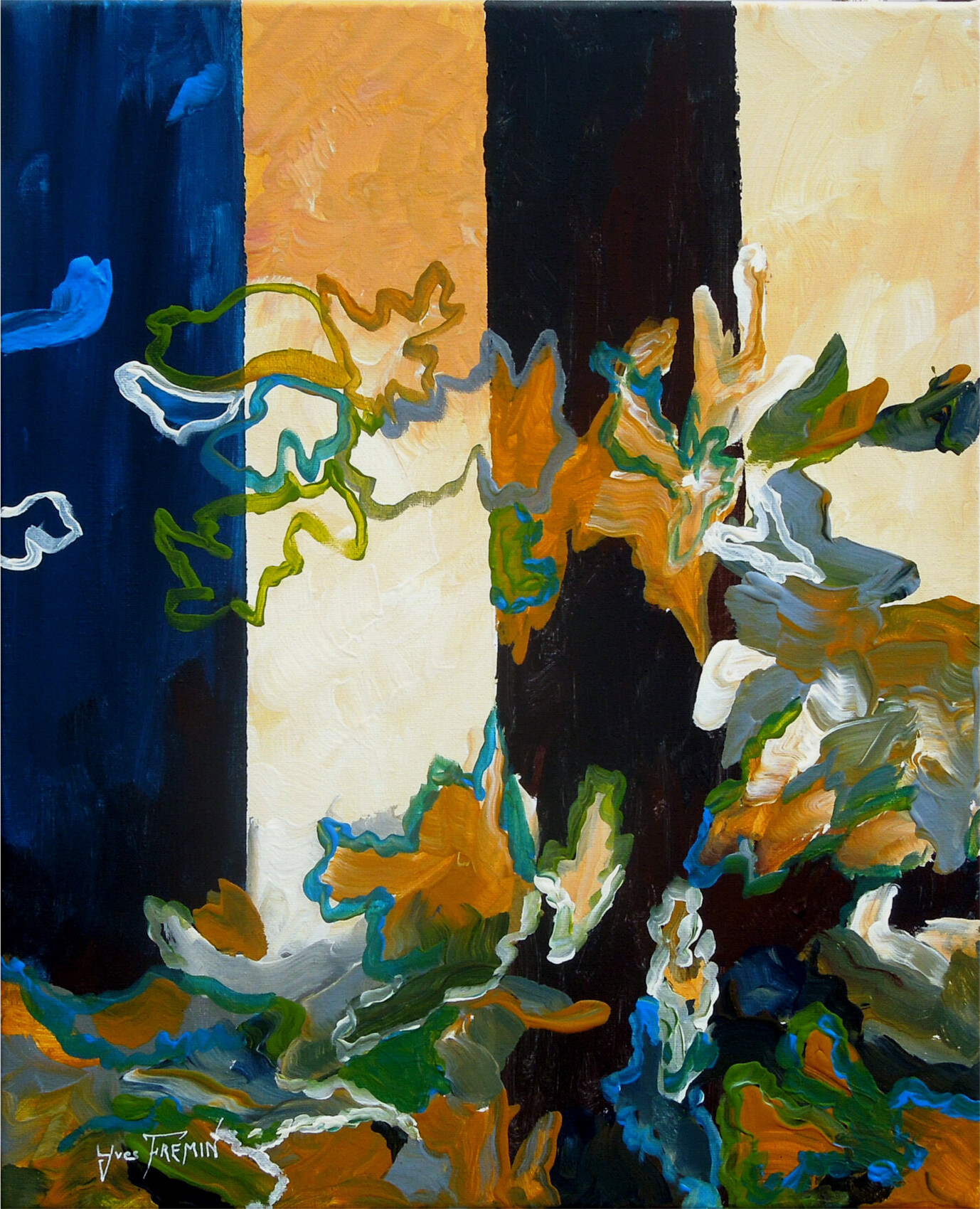 Acrylique sur châssis entoilé de 50 x 70 cm. Son titre vient du fond découpé en quatre bandes verticales d'égale largeur. Un fond ne suffit pas pour créer un tableau. Devant il y a une farandole de fleurs qui anime la composition.