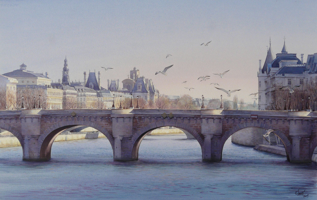 Aquarelle originale - Paris - Ces mouettes convergent toutes vers ma signature, d'où le titre... Format : 100 cm x 62 cm. Collection privée. Size : 39,3 in x 24,4 in. Private collection.
