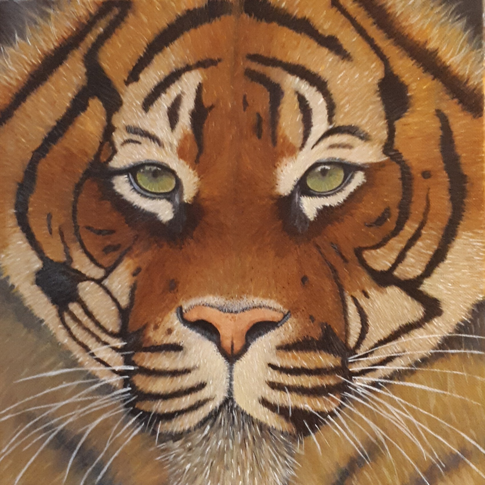30x30, acrylique sur toile, décembre 2020. Pourquoi la tigresse au féminin ? Parce qu'elle représente ma rage de peindre ! Après plus de 15 ans d'oubli, j'ai enfin ressorti mes pinceaux et ce magnifique félin est apparu.