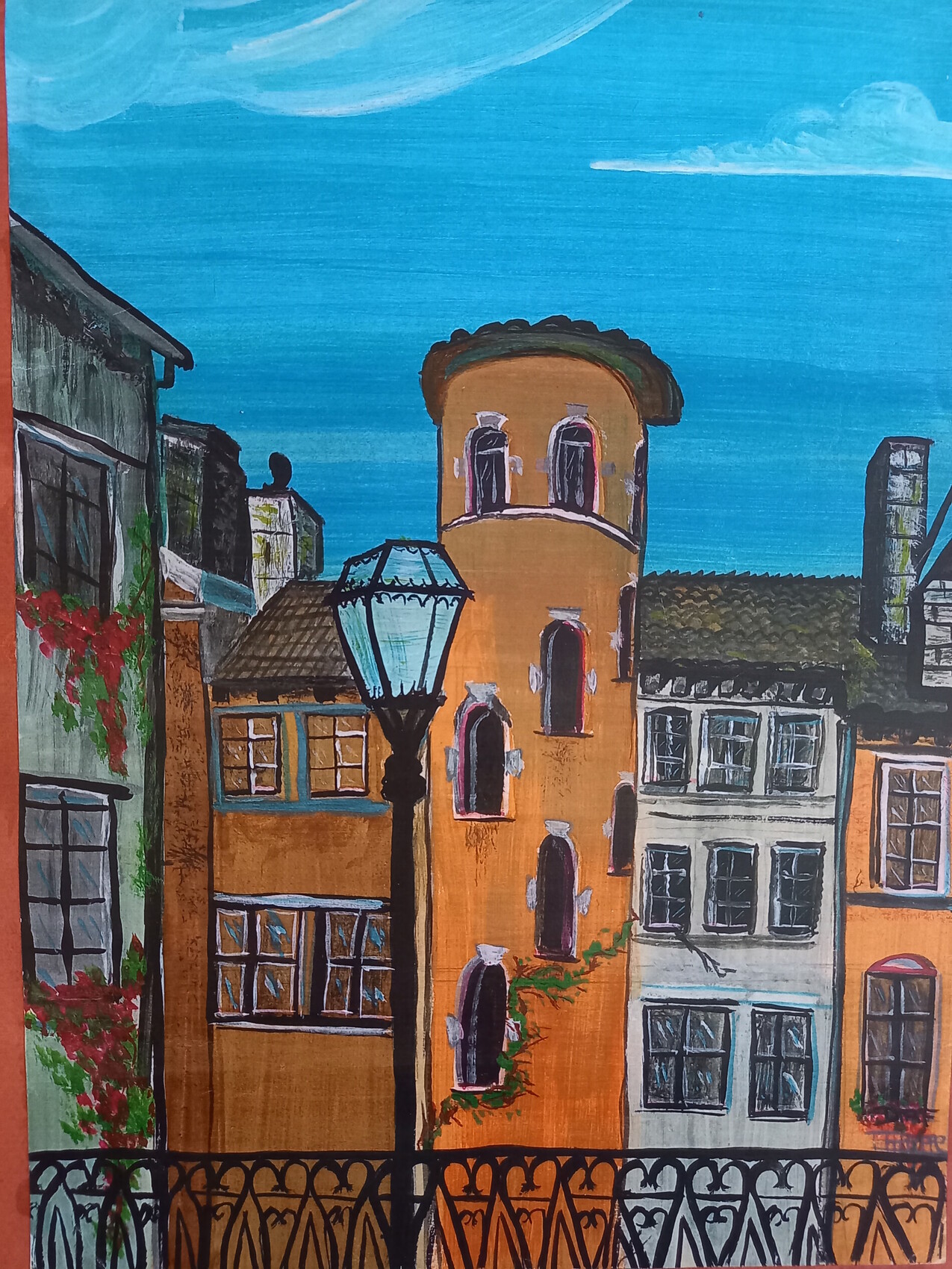 Gouache format A4. 1982. La tour rose du vieux Lyon.
