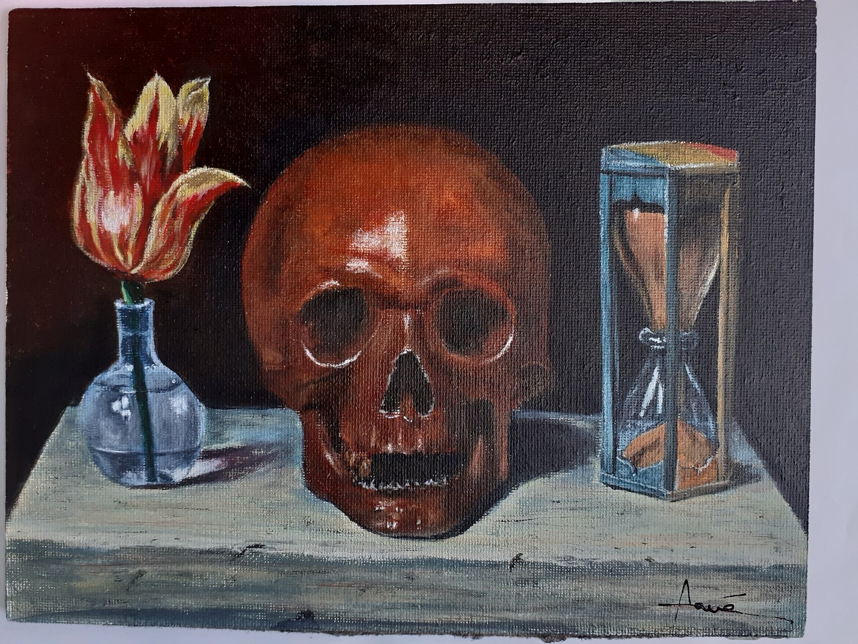La vanité, sœur de l'orgueil, un autre mauvais sentiment, bref, l'image en dit long, sur la nature humaine, et particulièrement, le crâne, nous rappelle, notre sort final, donc, une façon, pour dire, que l'humain, n'est rien, au lieu de se vanter, et s'énorgueillir, bravo thème original.
