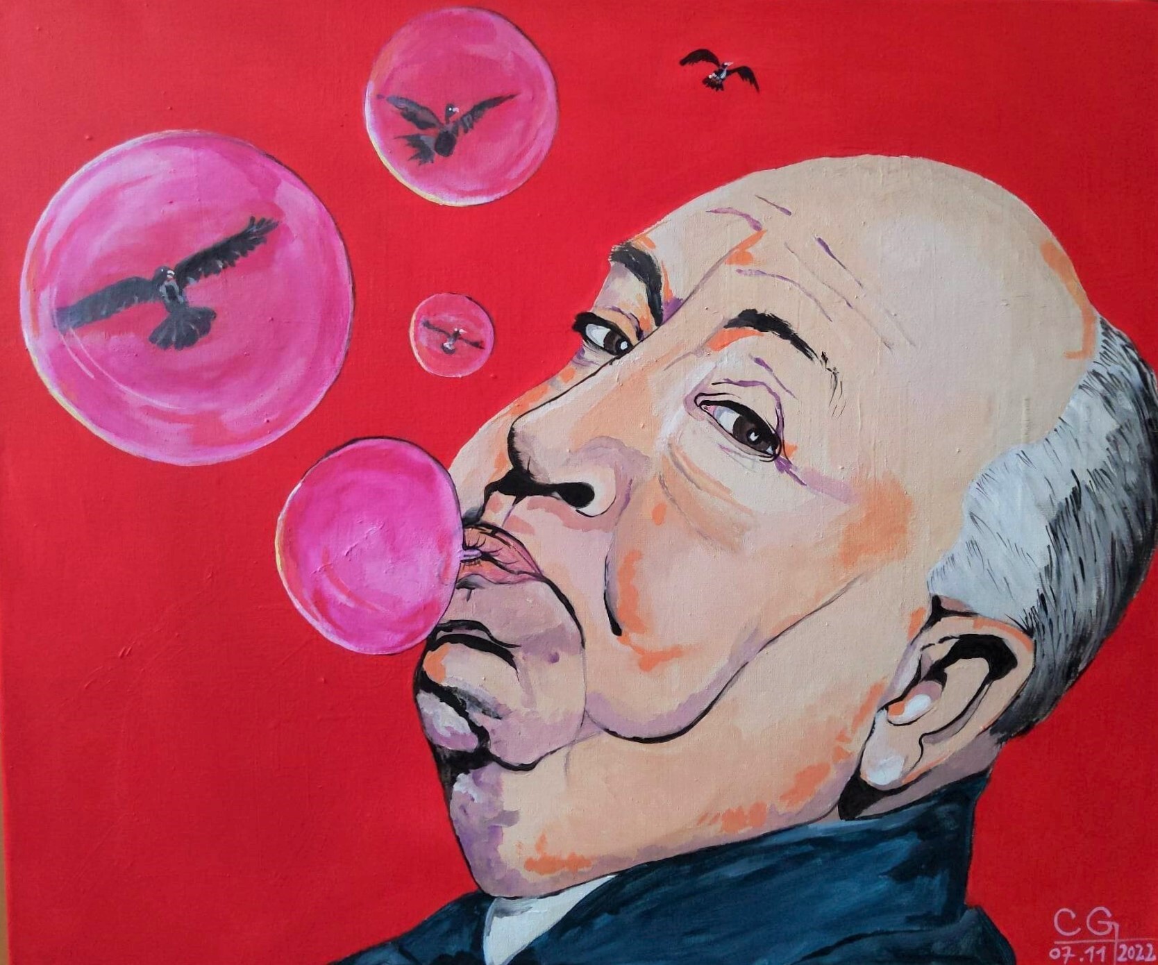 super idée Hitchcock mettant ses oiseaux sous bulles ! ! :)) très réussi avec son petit air malicieux et les couleurs me plaisent :) bravo Corinne