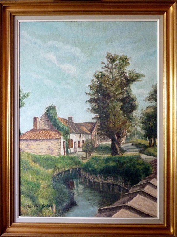 Peinture à l'huile sur toile réalisée en 1979 sur place. Ruisseau qui sépare la France de la Belgique. Format : 70 cm X 50 cm Monique DE GELAS