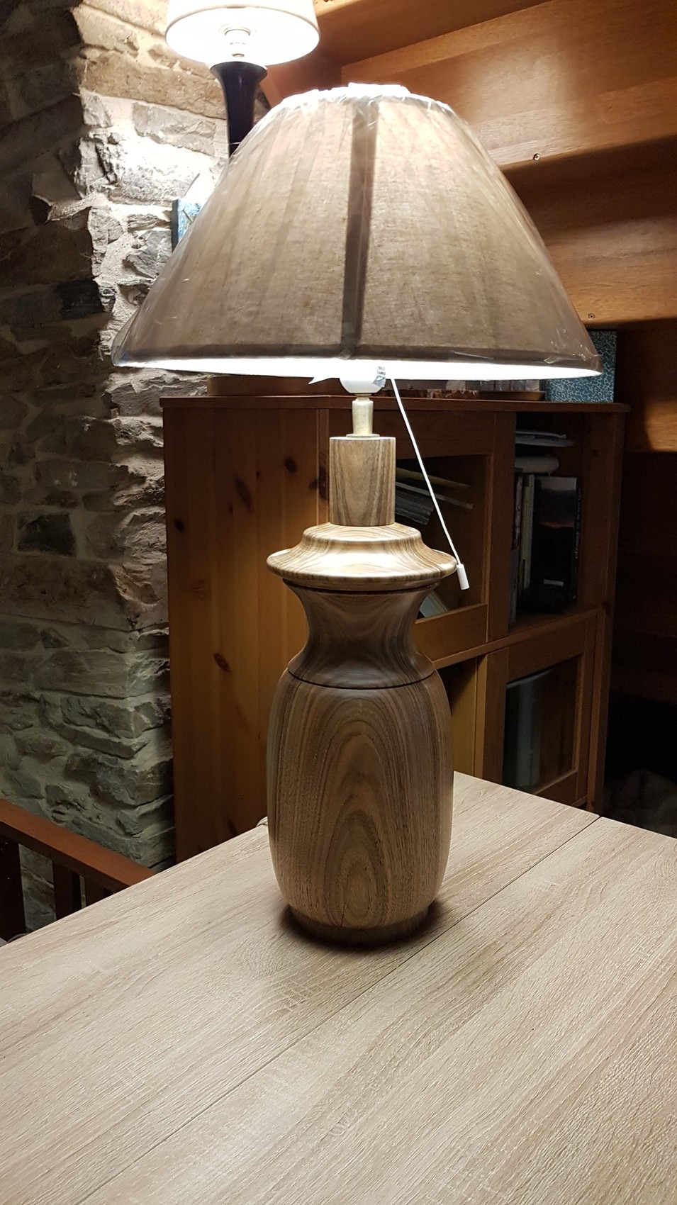 Pied de lampe en Noyer , environ 45 cm de haut (sans l'abat-jour) interrupteur à tirette sur la douille E27, abat jour diamètre 40cm, perçage dans le pied .