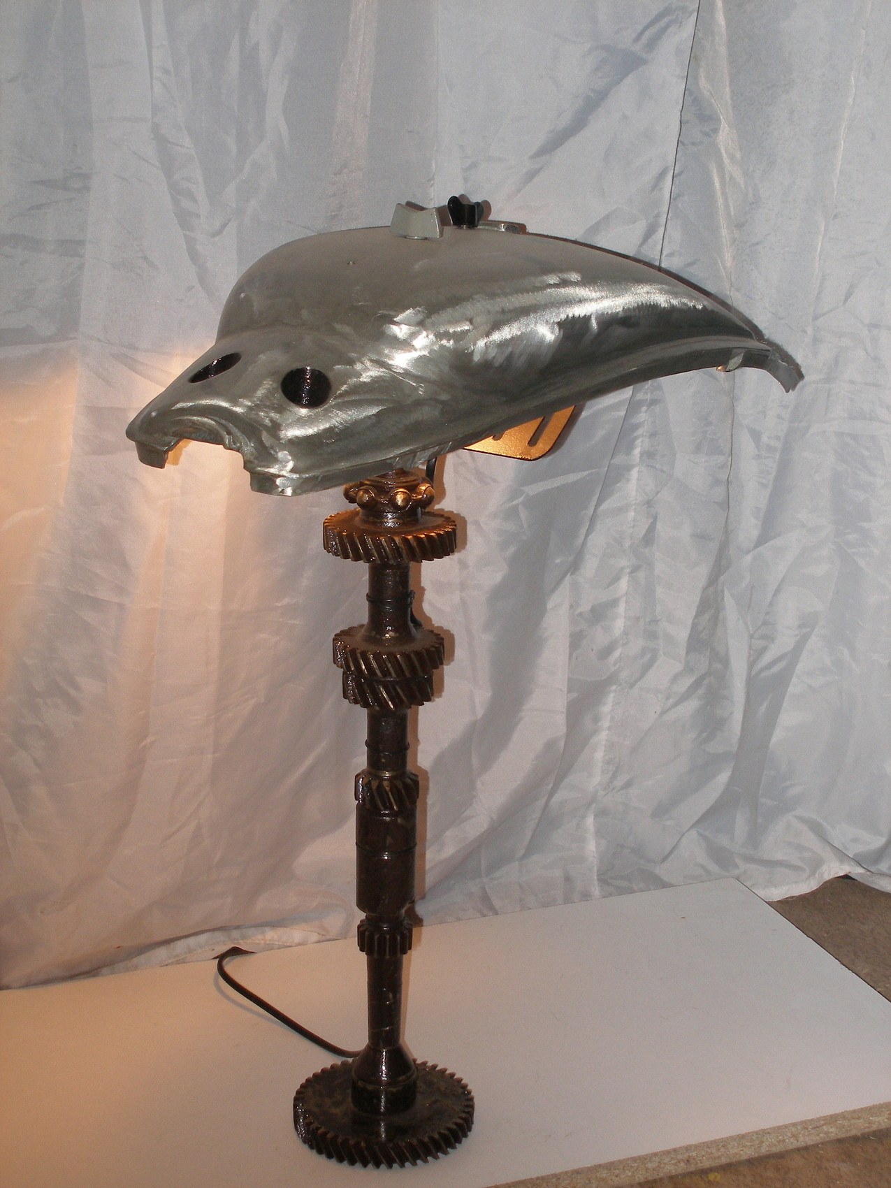 Lampe dauphin: Lampe sculpté et assemblé à base de fer de récupération. Deux pièces: Pignon de boite de vitesse et ancien luminaire de voie publique. Ampoule à LED. Hauteur 58cm, Longueur 46,5cm Largeur 28cm Fabriqué par Nel.