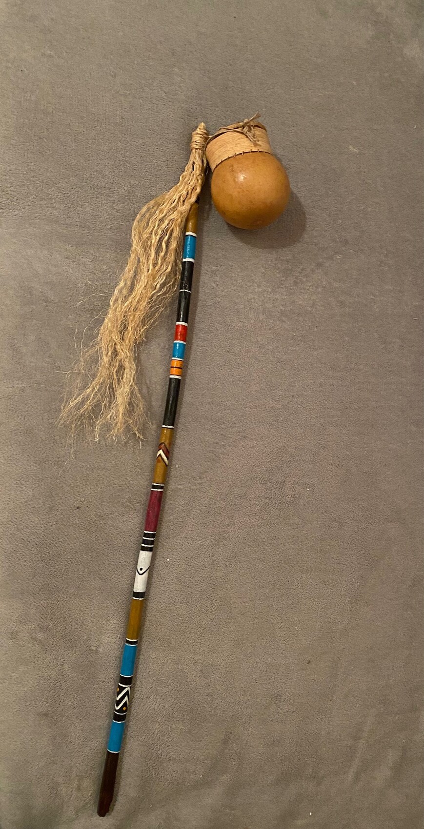 Acrylique sur bois. (ajout de ficelle et calebasse) Réalisé pour l’anniversaire de mon petit-fils sur le thème de l’Afrique.
