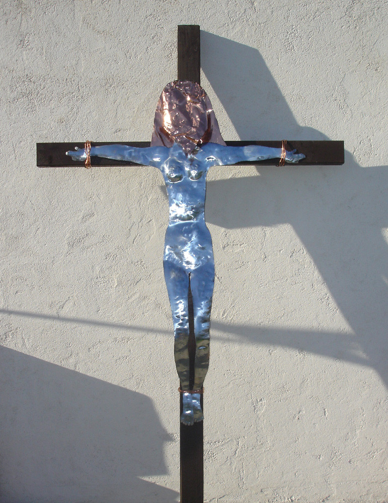 Femme voilée crucifiée. Matières : cuivre et zinc Hauteur 180 cm Largeur 120 cm Prix 1200.00 euros