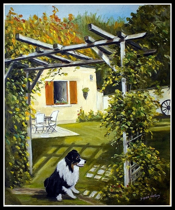 Bonjour Didier une oeuvre dont on se lasse pas de regarder ...une jolie maison entourée de verdure le petit chien qui attend son maitre et le maitre en train de peindre cette douceur printanniere que c est agreable.... en vous disant bravo Didier et bonne continuation j adore .....