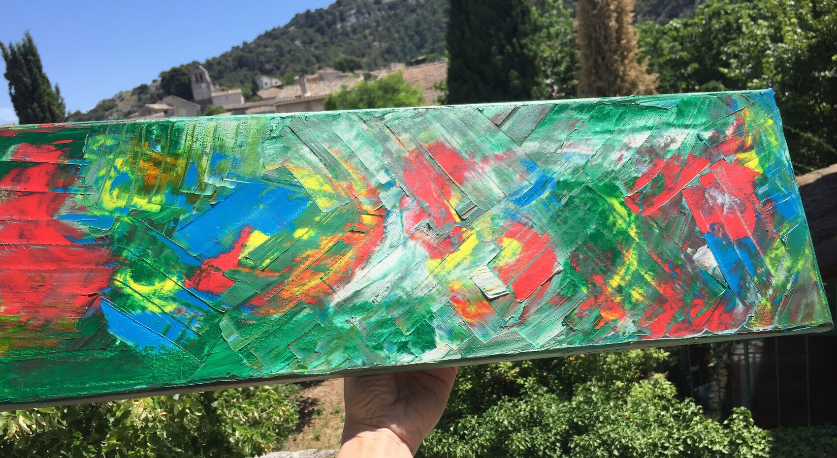 Les couleurs et les formes s’assemblent pour profiter de cette instant de bonheur qui puisse au profondeur de cette douleur. 60x20 Peinture à l’huile