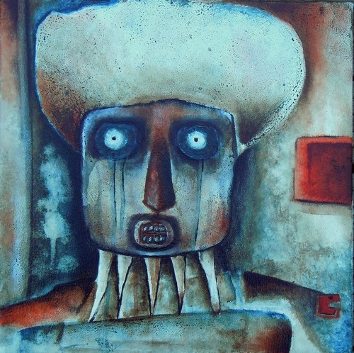 "Plus grand....ouvrez plus grand la bouche Monsieur Ferdinand...Sinon je ne peux pas vous arracher la dent...." Ben justement, je ne veux pas qu'il l'arrache cette dent. Elle est à moi depuis plein d'années et je l'aime. Je veux juste ne plus avoir mal, sortir du fauteuil blanc et partir faire un tour en vélo. Et surtout, je ne veux pas ouvrir la bouche. Il peut se débrouiller sans moi. Après tout c'est son metier. Demain je peins un dentiste...et ça va saigner.... "Ta bouche Ferdinand