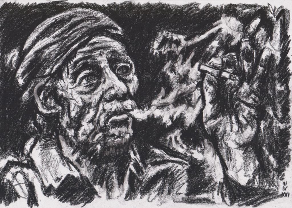 c'est vraiment très beau! la pierre noire te réussie super bien! ton personnage me fait penser a un vieux marin dans une taverne! bravo mon ami!