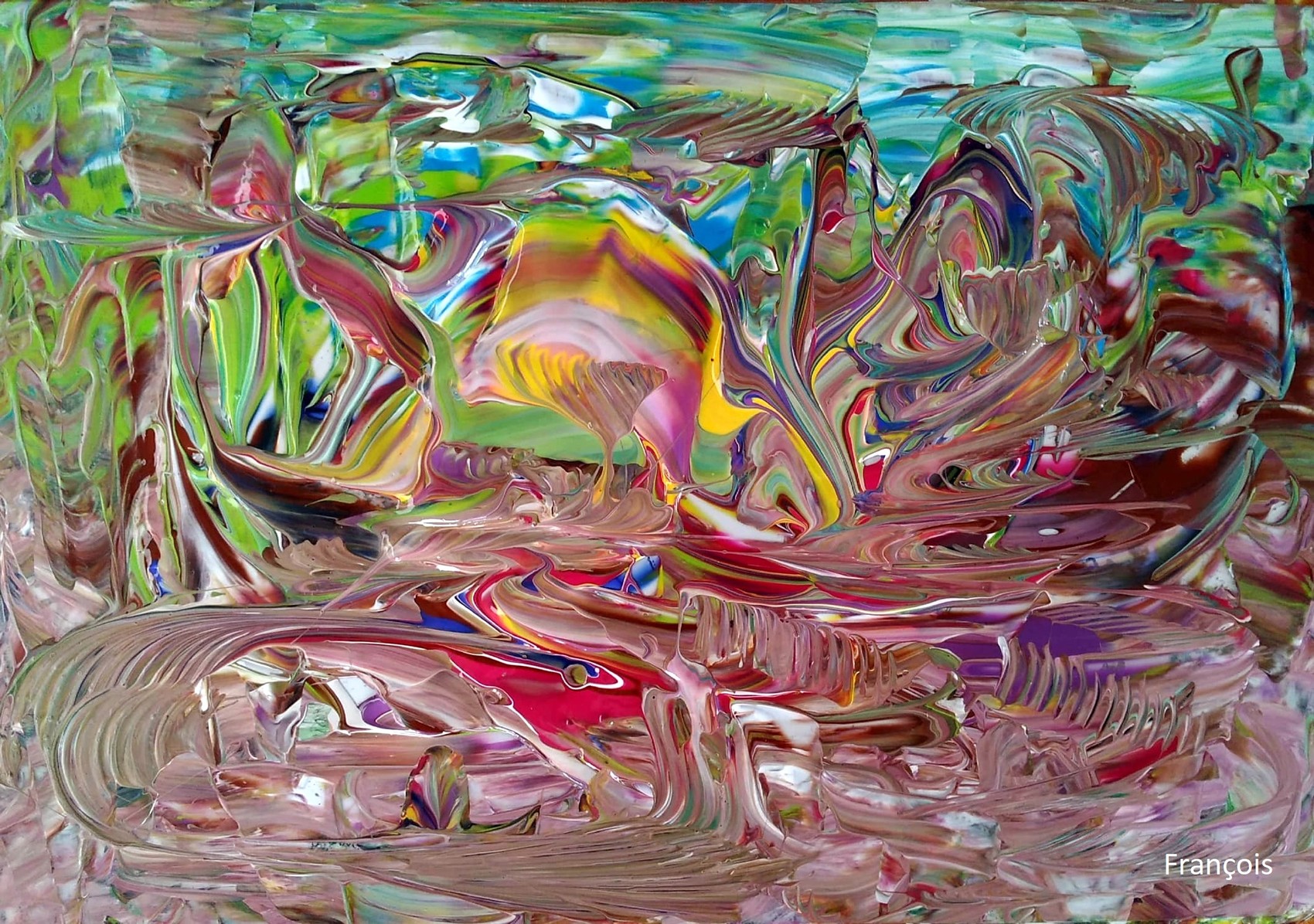 peinture abstraite lyrique, intuitive, acrylique, réalisée sur feuille pvc transparente, 30*40 cm