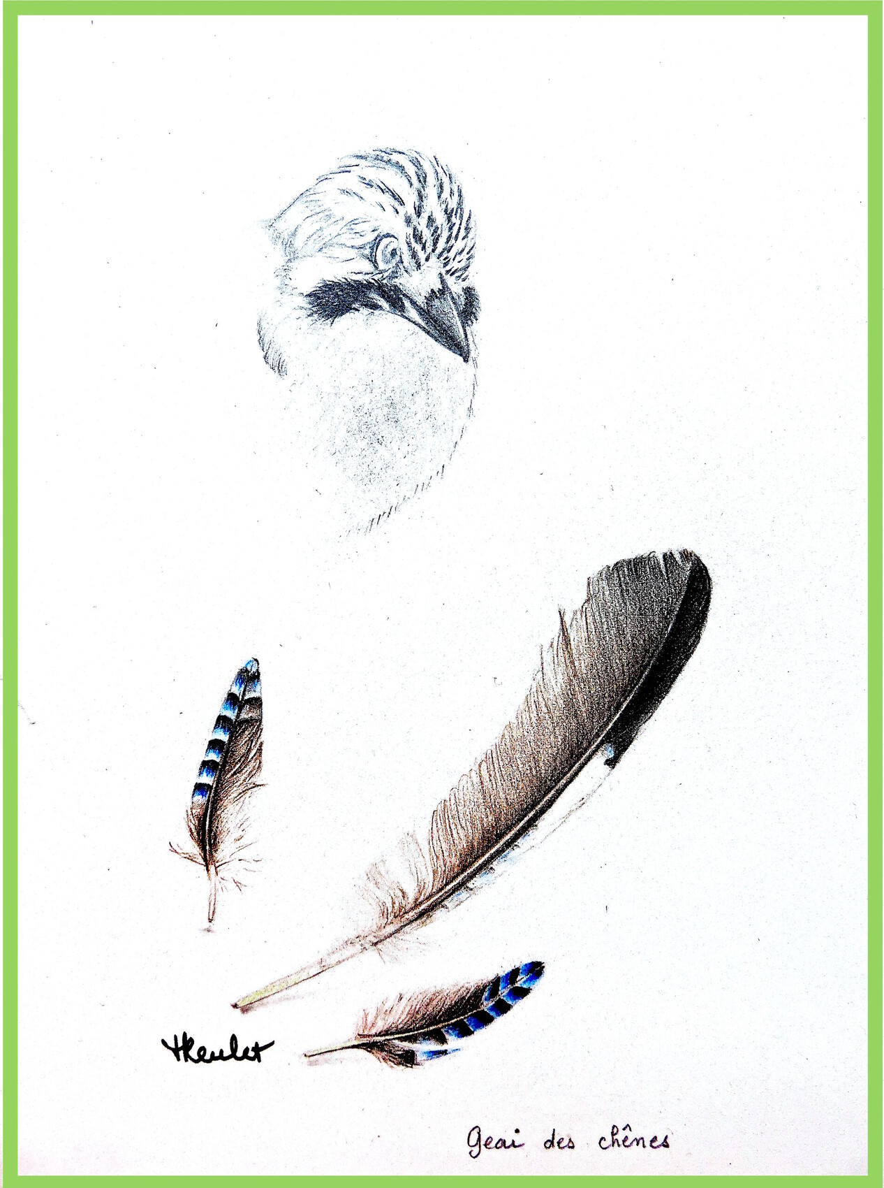 Le geai des chênes (Garrulus glandarius) / Drawing The head and feathers of an eurasian jay