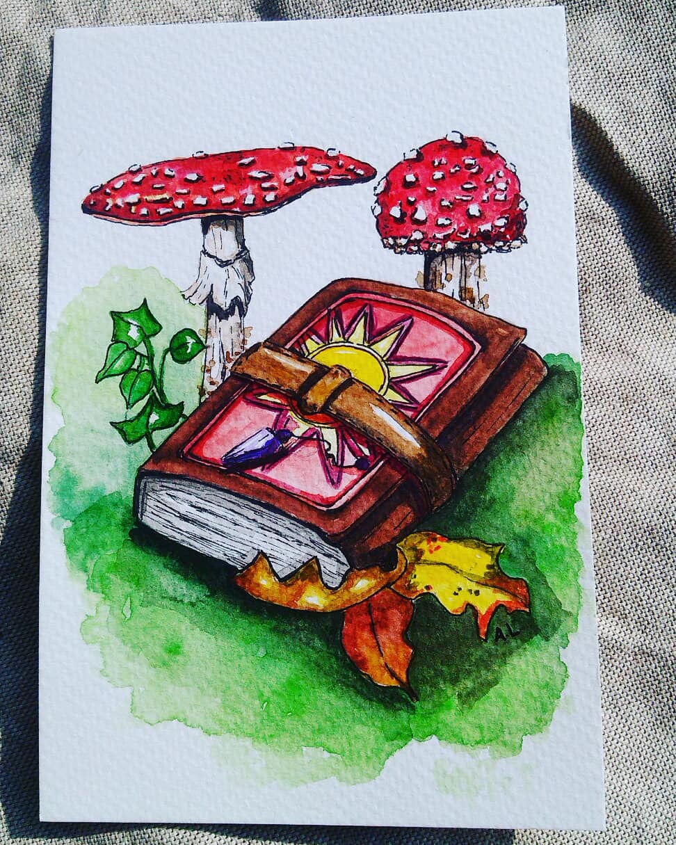 illustration aux couleurs de l'automne avec son grimoire entouré de beaux champignons Amanite Tue Mouche. Dessin pour enfants ou grands enfants avec son univers magique que j'affection beaucoup. Réalisation à l'aquarelle Monali sur feuille aquarelle format carte postale de marque Monali.