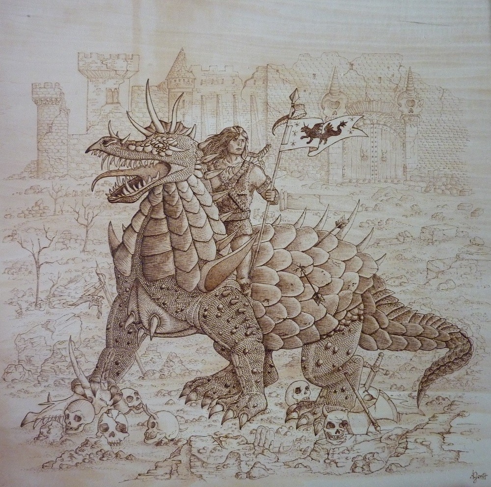 Pyrogravure sur bois, héroïc fantasy, guerrier chevauchant un dragon. Tableau pyrogravé sur contreplaqué asiatique, format environ 60x60 cm.