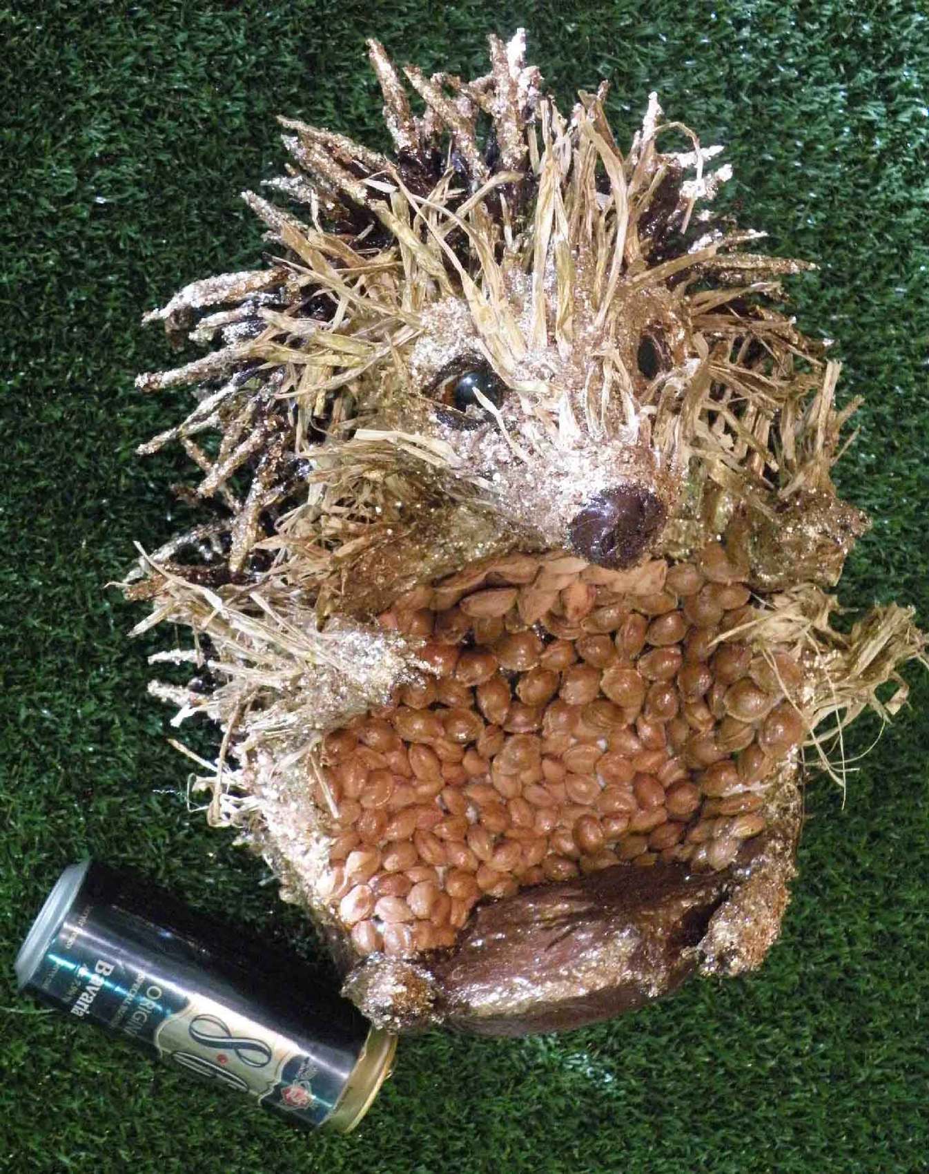 Cette sculpture fait partie de l'exposition L’Essence de Nice. Lauréate du 1er Trophée de l'Environnement à Nice en 2010. Réalisé à partir de déchets,elle représente un hérisson.La bière renversée est un anti-limace naturel,les pesticides pouvant tuer cet insectivore. Déchets utilisés: Cannette de bière, Chutes de plastique, de fer (piquants), pots de yaourt, chutes de raffia, papier journal, Noyaux d'abricot. Dimension: à venir