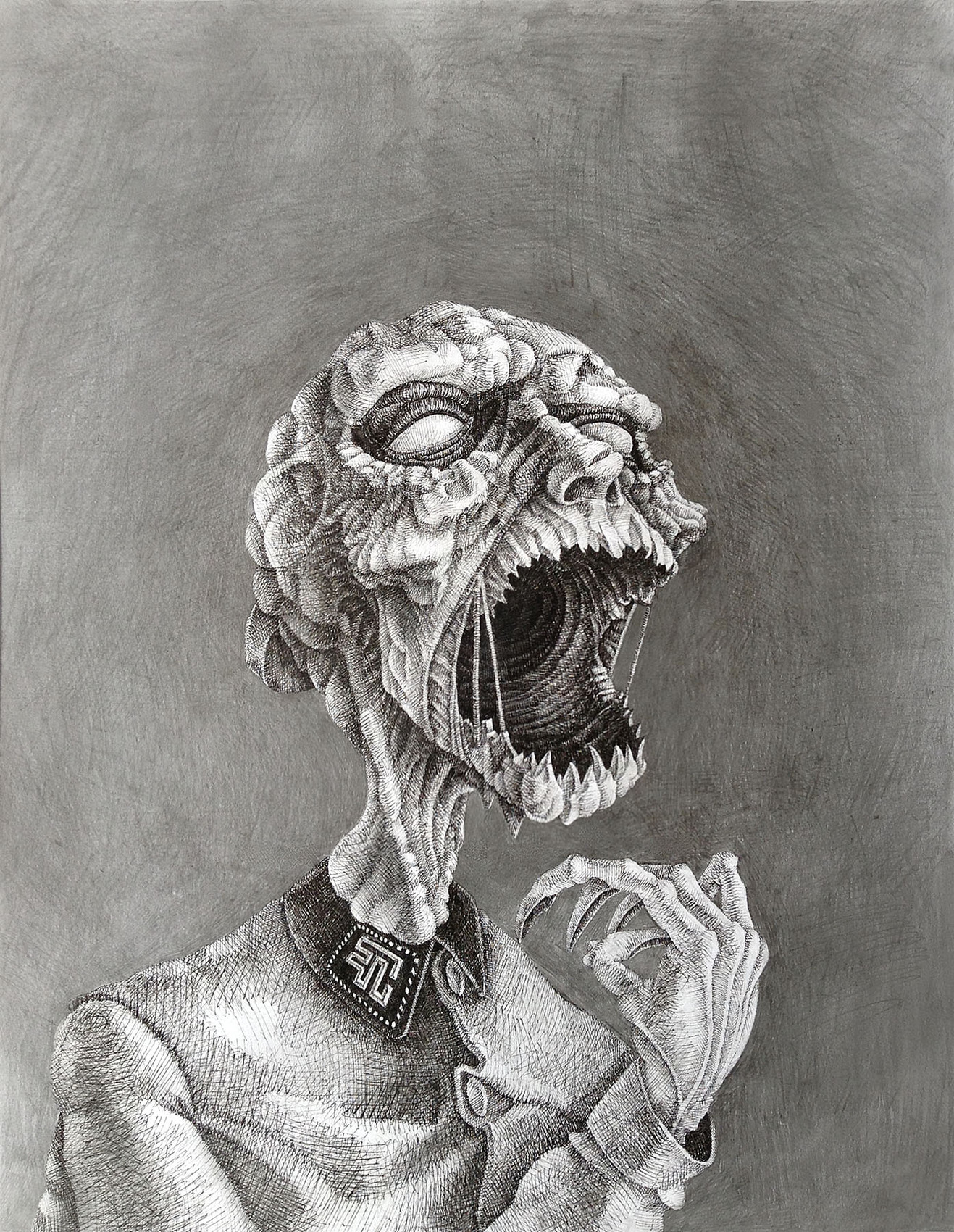 Dimensions: avec cadre 53x73x3,5cm /50x65cm (format raisin) Technique: stylo graphique/ crayon gris Portait de personnage aux traits défigurés, torturés, exagérés, cabossés. Marqué par les épreuves de la vie et les souffrances endurées, il en est profondement meurtis. Inspiré des gueules cassées de la 1re guerre mondiale, et des peintures de Salvador DALI
