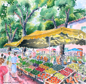 Aquarelle de ROGER J. coté à Drouot réalisée sur place pendant le marché de Cotignac dans le Haut-Var.Le sujet mesure 36 x 25 cm pour un encadrement de 50 x 40 cm Cet authentique village provençal possède une galerie le Cercles des arts , ancienne chapelle contingüe à l'église où exposait régulièrement l'artiste .