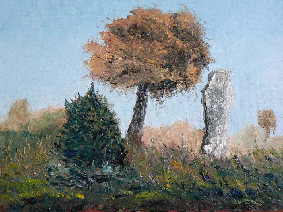 Huile au couteau: 30x24 Ce monument est, par sa hauteur, le dixième en France et au monde. Trapézoïdal à la base et parallélépipédique sur sa hauteur, le menhir se termine en arrondi. Aujourd'hui isolé, le menhir de Saint-Jean est probablement l'élément d'un ensemble mégalithique s'étendant jusqu'au village du Neuziou, dont la trace est conservée par la présence de grandes pierres affleurant le sol. Un autre menhir long de 6 mètres est couché à 250 mètres du site.