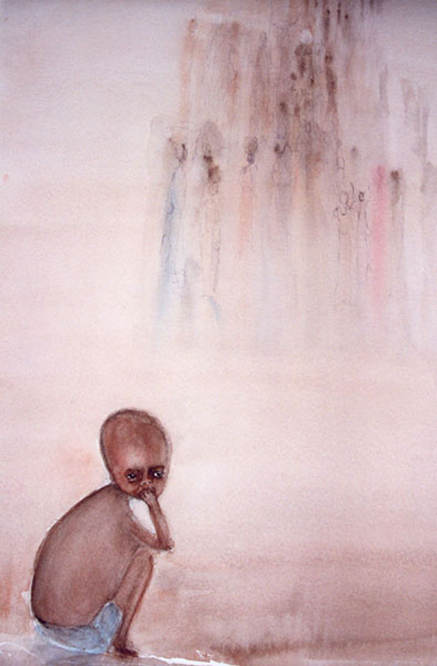 Aquarelle Un enfant de réfugiés a du être abandonné, le long du chemin