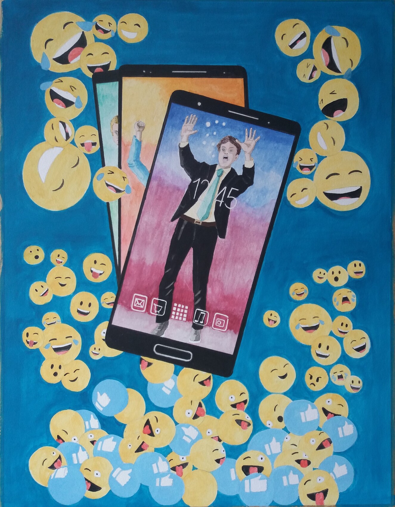 un personnage est bloqué dans un téléphone mobile et d' autres aussi apparemment derrière et autour des smiles qui semblent se moquer de lui.