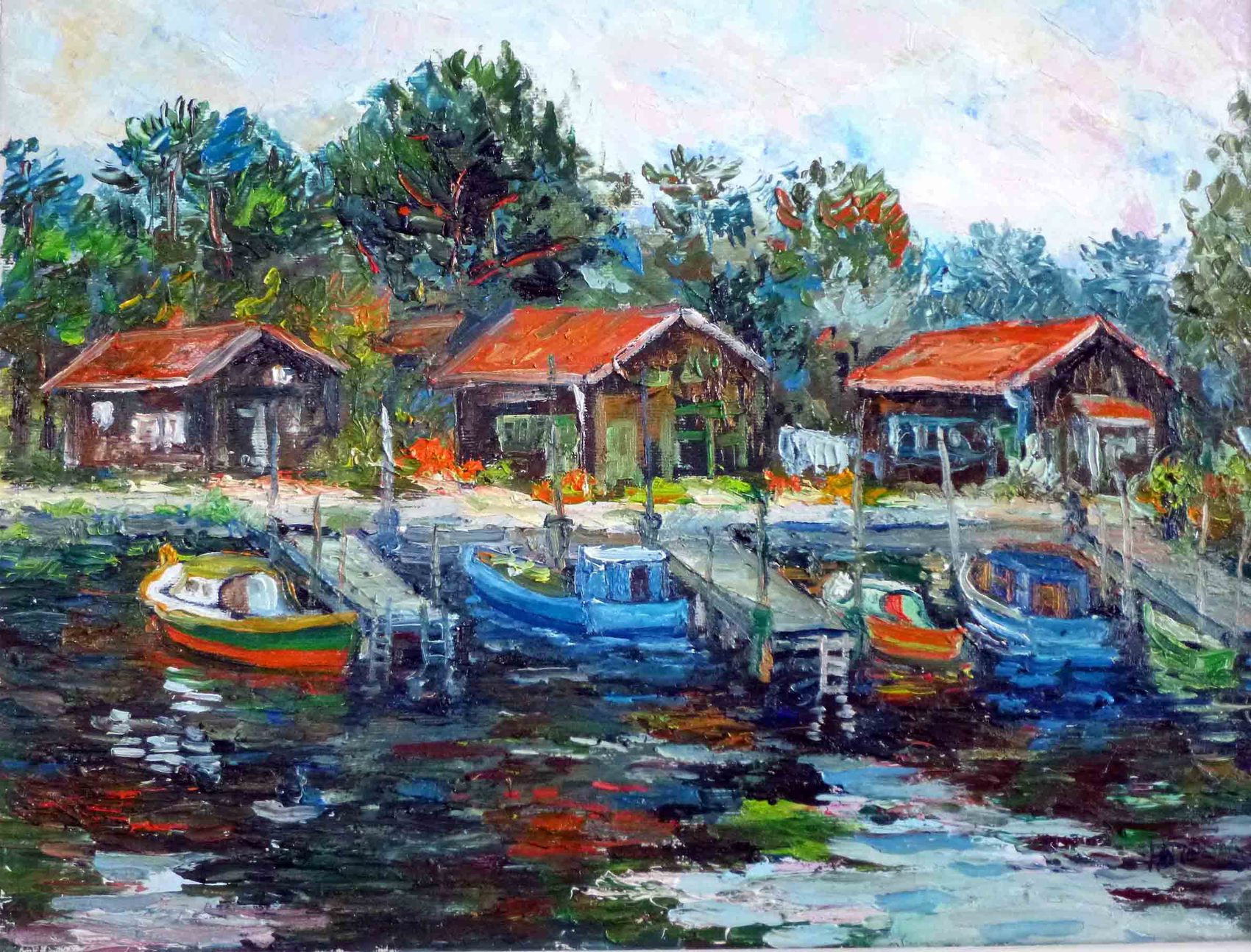 Œuvre originale, huile sur toile de 40 cm de large sur 30 cm de haut. Des bateaux de pêche amarrés dans le port de La Teste. Loin des circuits touristiques, ces bateaux sont chargés de sueur et d'embruns. Ils ramènent ces huitres du bassin déjà chère à Rabelais C'est ce côté laborieux que j'ai voulu rendre, ces odeurs de goudrons et de sel. En contrastant les bruns des cabanes en planches goudronnés et brunis par le soleil, les pinasses et les bacs et cette eau foncée où se reflètent les batea