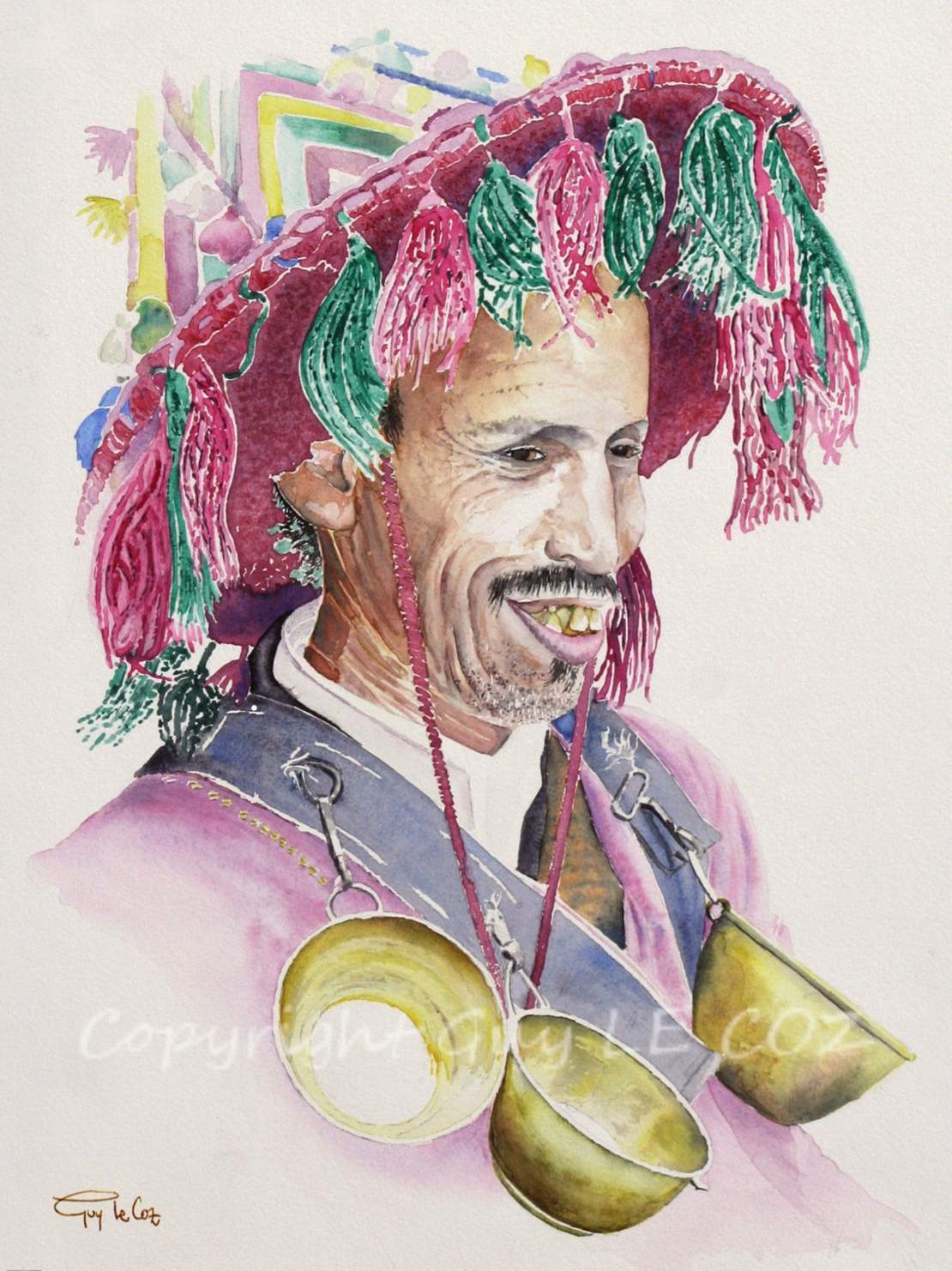 Le guerrab, porteur d'eau ne passe pas inaperçu, faisant retentir sa cloche pour annoncer sa présence. Apparaissant dans son costume et son chapeau de laines multicolores, son habit est orné de coupelles de cuivres ou de fer blanc. Agadir - MAROC. Aquarelle format 40x50 cm sur Arches grain moyen.