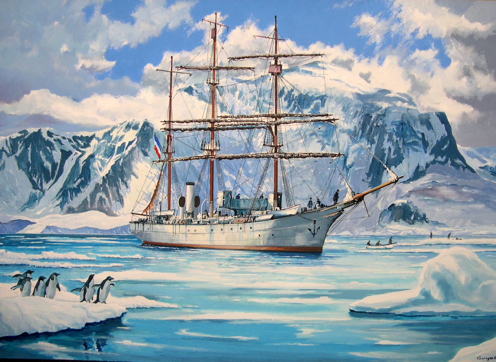 Le voilier d'exploration polaire du Commandant Charcot dans les glaces du grand nord (vers 1930). Gouache.
