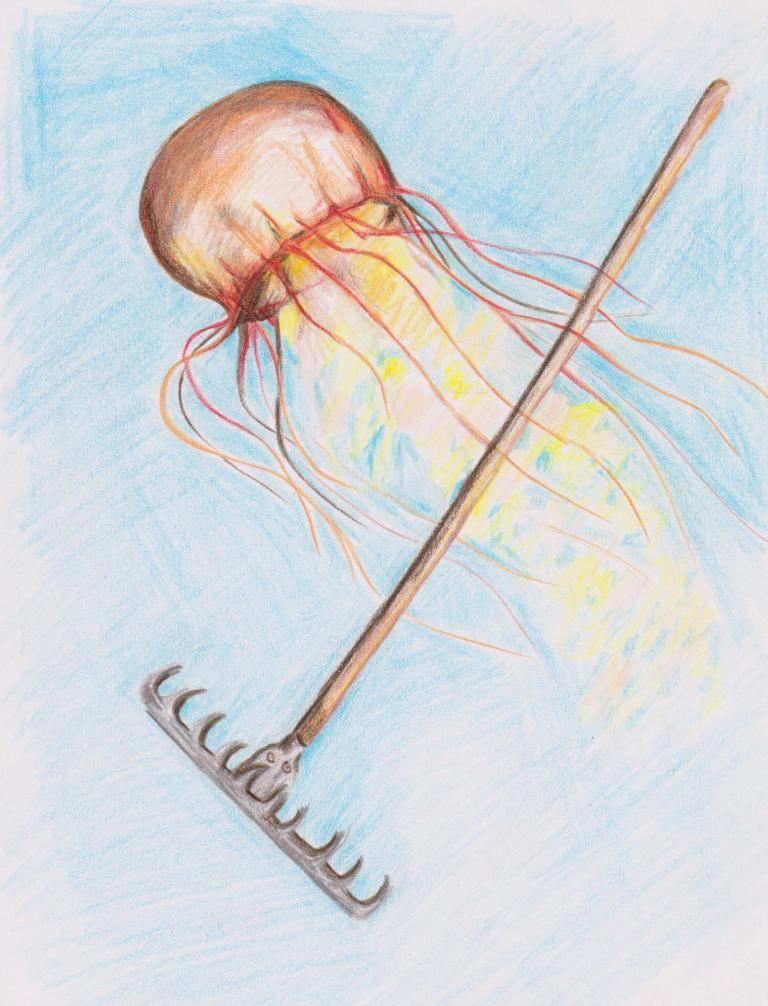 on peut faire de jolies oeuvres avec des crayons de couleurs. J'aime beaucoup ces couleurs douces. Bravo pour l'originalité de l'oeuvre !!!! de plus, la disposition du manche du rateau sur les tentacules de la méduse, font penser à un archer de violon sur les cordes. J'aime la totalité !!!! Bravo, bravo l'artiste !!!!