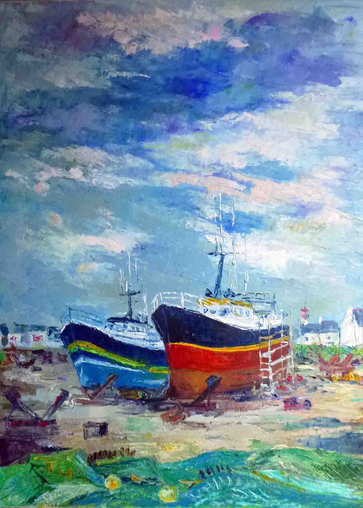 Huile sur toile travaillée au couteau, œuvre originale.60x81 Face au port du Guilvinec, les chalutiers se refonds une beauté sur le slipway avant d'aller retrouver leurs copains encore pleins d'embruns dans le port, prêts pour affronter et chevaucher fièrement l'océan.