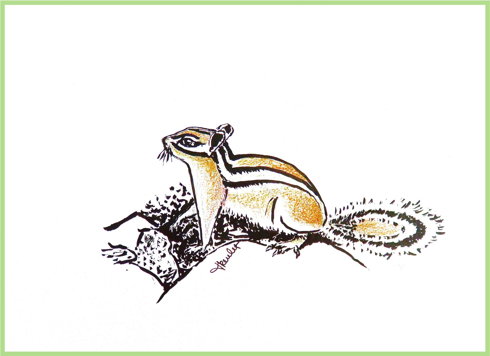 Encre et crayons de couleur, avril 2020, 14 x 21 cm. Seul tamia vivant en Eurasie. Depuis 2016 il est interdit de l’acheter-vendre-échanger-faire se reproduire en Union Européenne (raisons : maladie de Lyme et prédation des nids d’oiseaux) = Muriel REULET = Ink and coloured pencils, 2020. The only one Tamia living in Eurasia. Since 2016 it is prohibited to buy-sell-trade-breed in the European Union (reasons: Lyme disease and bird nest predation).