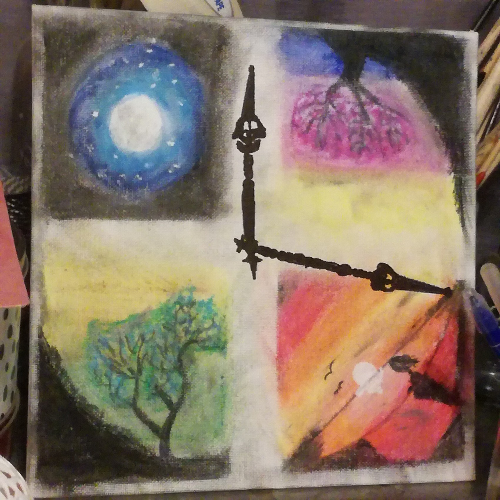 aux pastels et marqueur noir sur toile