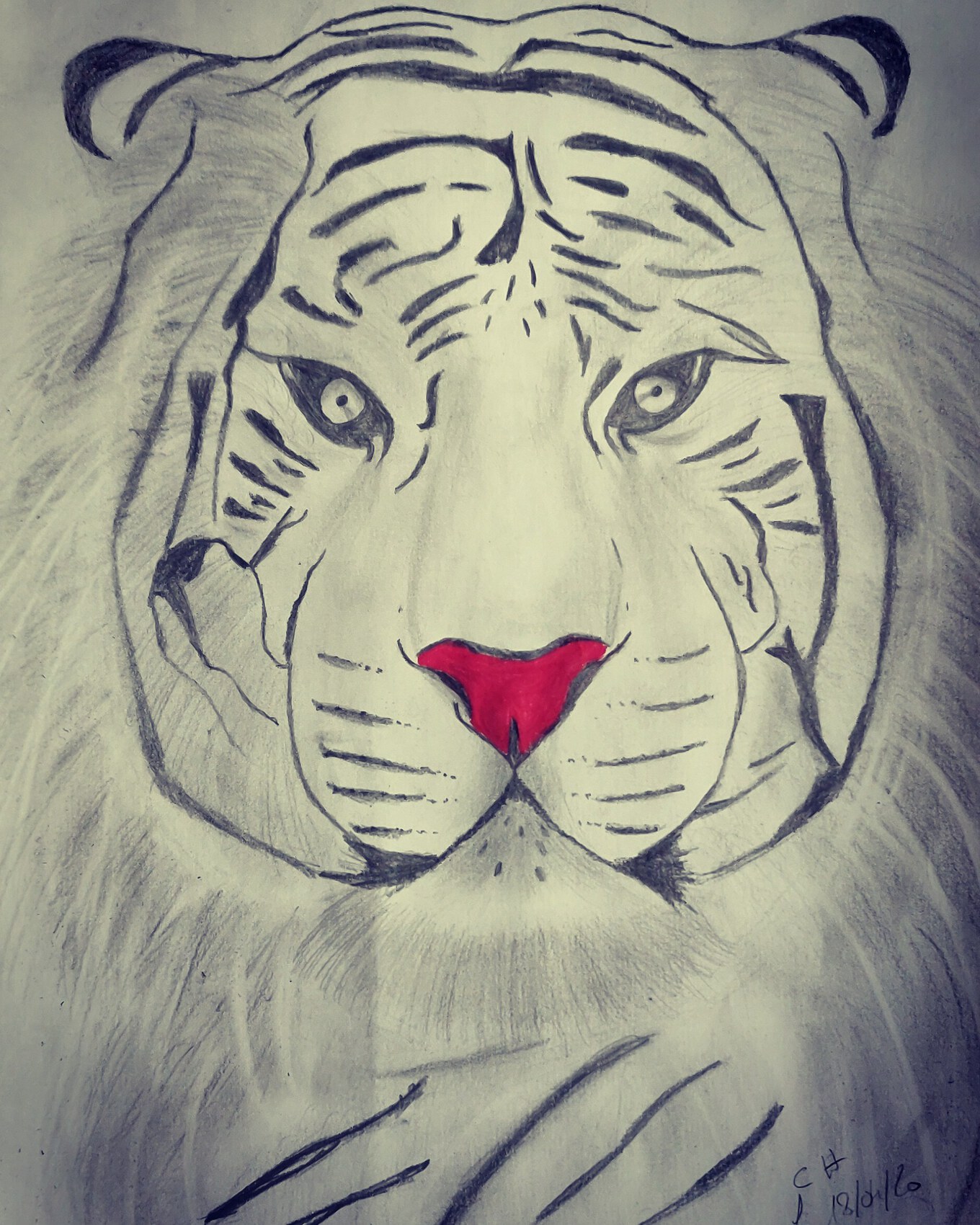Dessin sur papier simple au crayon HB et feutre rouge, le nez rouge représente la clownerie de l'homme envers les animaux.