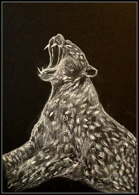 tout est dit ! ce félin montre ses crocs parce qu'il est en colère !! son pelage rend bien sur ce fond noir ! bravo Marie Cé , bonsoir à vous :)