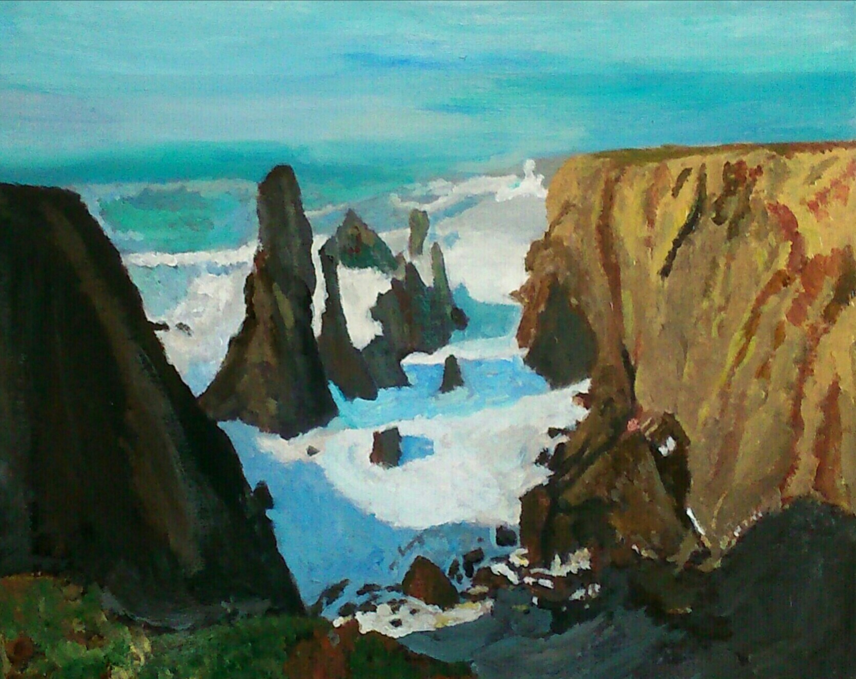 Les aiguilles de Port-Coton Belle-Île-en-Mer. (Morbihan) Acrylique, toile carton 24 x 30 cm. Leur nom vient de l'écume projetée par les vagues au pied des rochers par forte houle, cette écume ressemblant à un voile de coton. https://www.artpal.com/cothy-art1