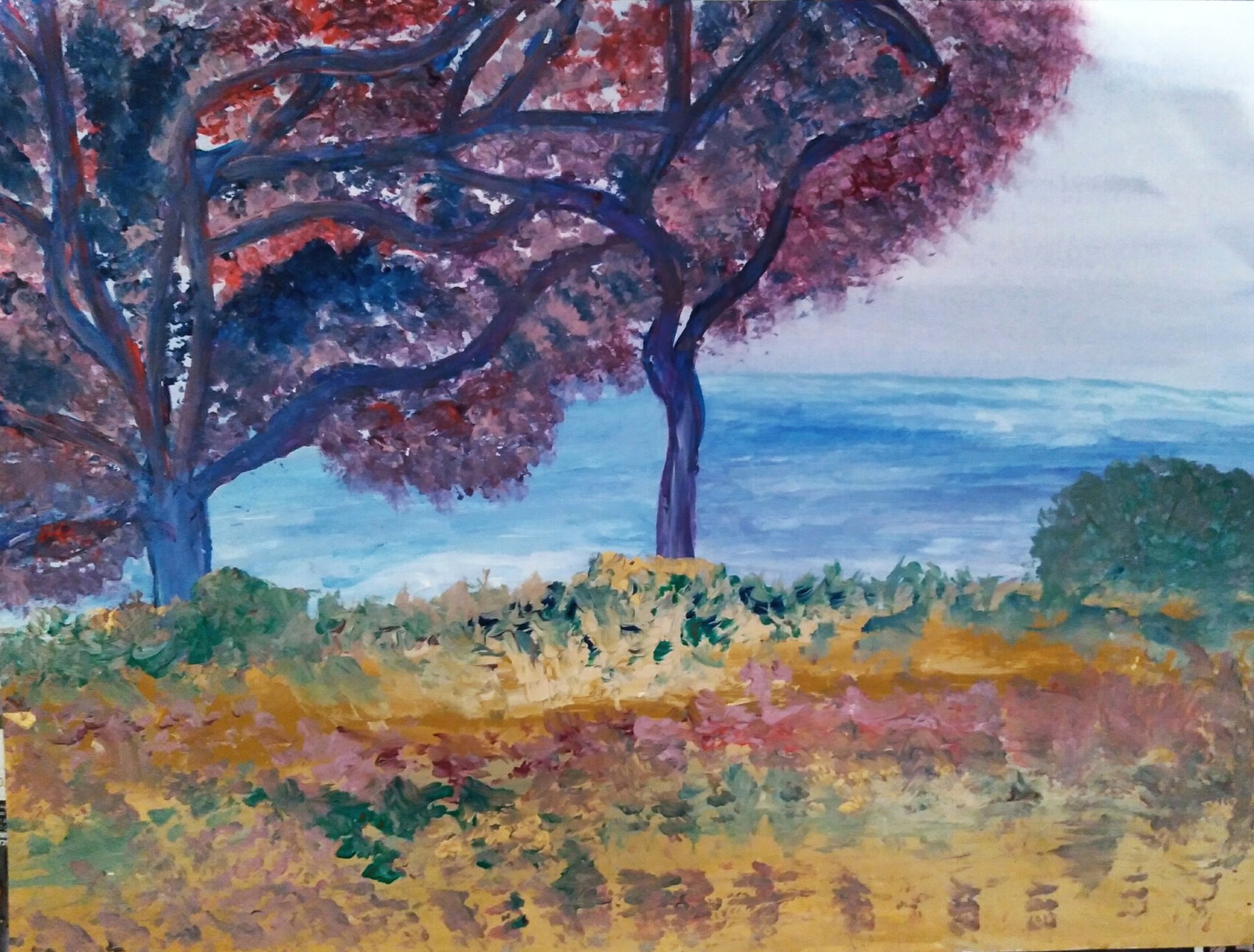 Comme les âmes jumelles, les arbres jumeaux ne font plus qu'un, de part les branches , ils ne se ressemblent pas vraiment par les couleurs ... mais ils sont unis à jamais. Ds a (acrylique) 2020 (48x36)