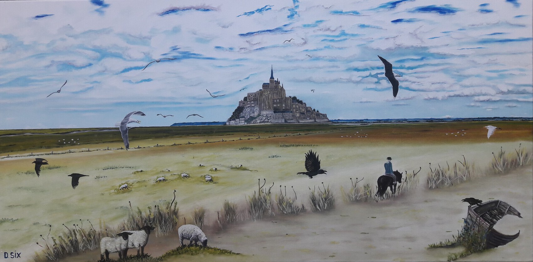 Félicitations Didier pour cette très jolie qui nous transporte dans l'atmosphère de herbus du Mont Saint Michel. On y découvre toute une vie animale avec les moutons de pré salé au premier plan très finement peints. tous ces oiseaux en plein vol rendent le tableau très vivant. Les couleurs sont douces et chaudes à la fois et le ciel semble s'ouvrir pour faire apparaitre au loin la Merveille. Tout est en place pour le régal des yeux !