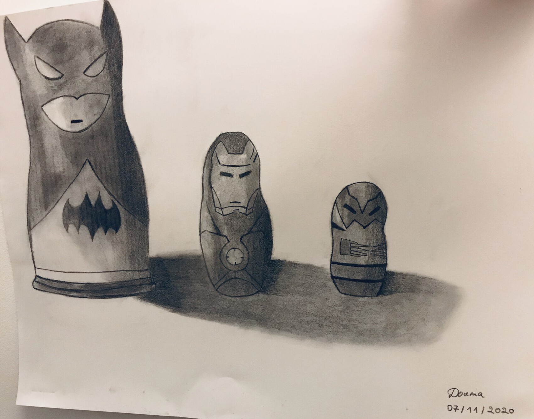 Reproduction de poupées russes Batman, Ironman et Wolverine. Dessin format raisin A3 50*65 Fusain et crayon