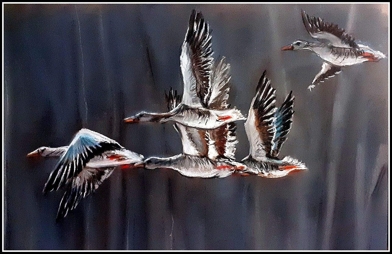 Salut l'ami , une belle composition de tes oies sauvages !!! Un beau pastel ! Bravo Didier