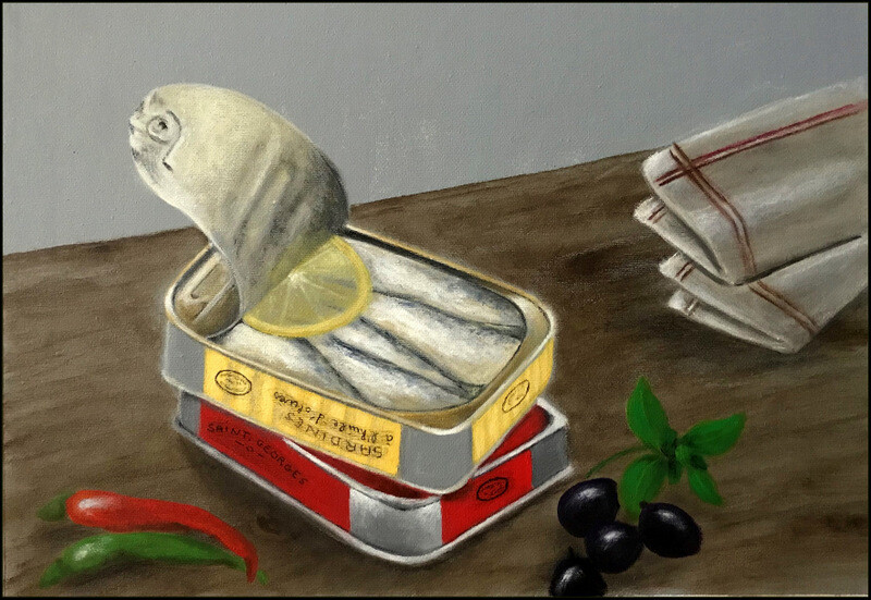 Bonsoir, Marie Cé. Nature morte très réaliste, les sardines c'est bon toute l'année avec quelques olives un régal. Bravo Marie-Cé ! Agréable soirée. Amicalement,