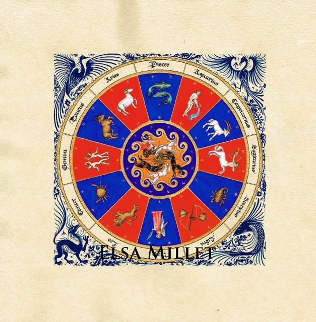 Cette enluminure présente les 12 signes astrologiques dans un disque bicolore typique de la période médiévale. Dans cette création de format 20x20 (30x30 hors tout), les couleurs sont constituées de pigments et d'une détrempe médiévale aux ingrédients naturels, posées sur du papier artisanal. L'alternance des couleurs traditionnelles médiévales rouge vermillon et bleu outremer donne un étonnant dynamisme sur lequel s'épanouissent les symboles des signes du Zodiaque. Chaque signe est traduit par