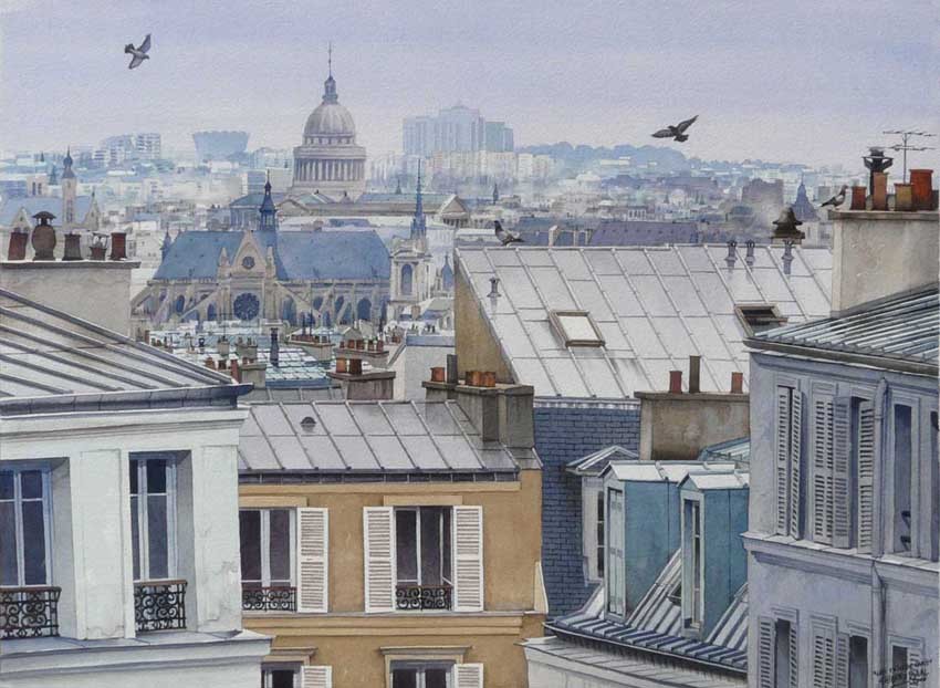 Aquarelle originale - L'horizon Parisien vu des hauteurs de Montmarte. Format : 75cm x 55cm. Collectrion privée. Size: 29,5 in x 22 in. Private collection.