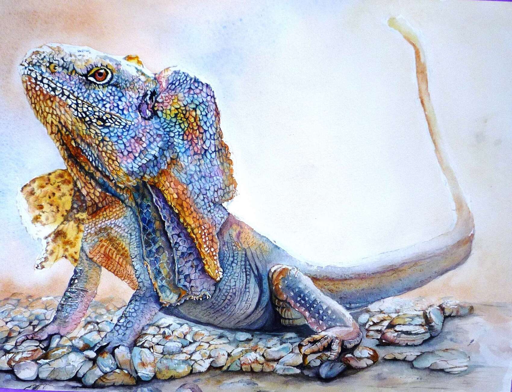 Aquarelle 40x50 "Lézard à collerette au soleil "