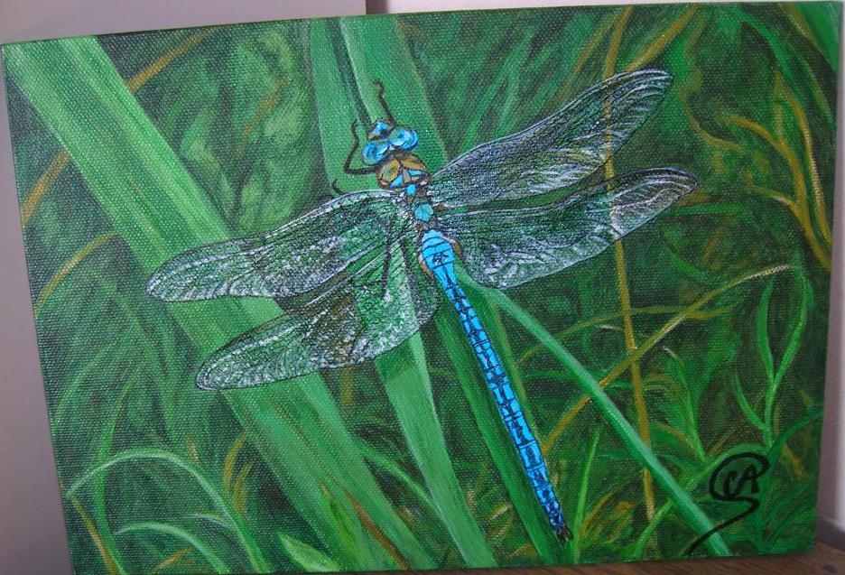 Libellule réalisée à l'acrylique sur carton entoilé traditionnel. Original signé
